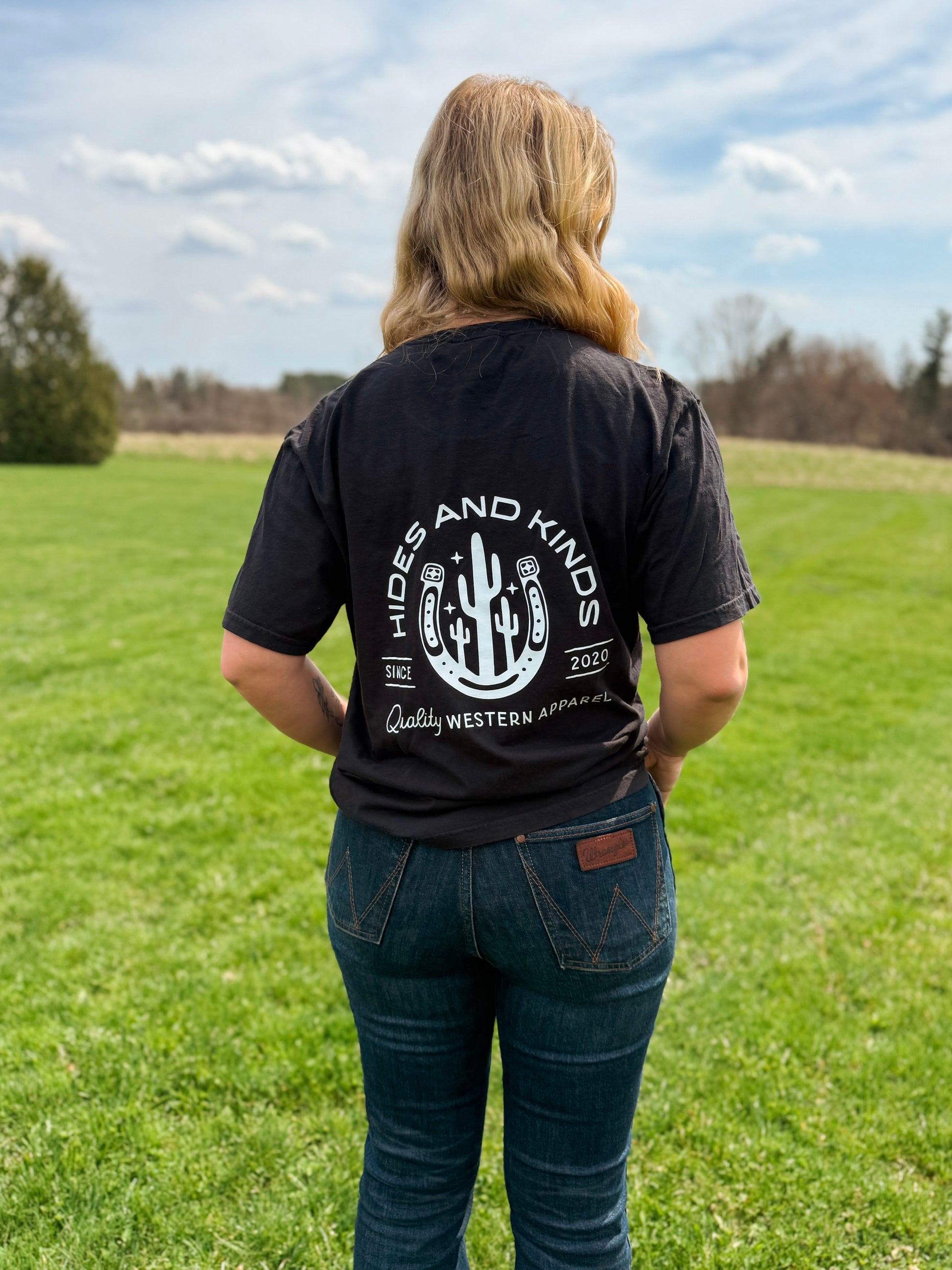 The Branded Horseshoe Pocket Tee in Black is a clean classic with a bold western touch. Made from soft cotton, this tee features our signature HK horseshoe logo on the front pocket and the back. With it's relaxed unisex fit and timeless black finish, it’s built for effortless everyday wear.